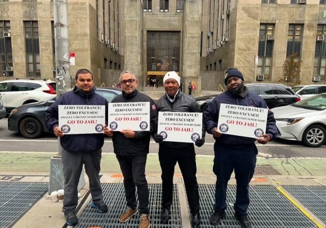 OA Division Transportation Chairman Mike Rodriguez, Vice Chairman Derick Cruz and Recording Secretary Kirby Nketiah at Manhattan Supreme Court accompanied Manhattan Road Dispatcher Luis Rodriguez who was assaulted on his post September 4, 2024. The alleged suspect in this case was arrested and has remained in jail since his arrest. This suspect has a long rap sheet of violent crimes and after his case was called today he remained in jail where he belongs.