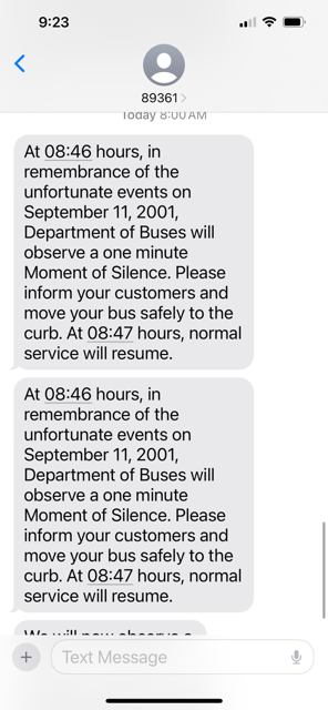 Today the Transit Authority categorized the terrorist attacks on September 11, 2001 as “unfortunate events”. This message was sent out on every bus radio in New York and in a mass text message. I called them out on it, and will not drop it as this is insulting and a watering down of what happened that day.