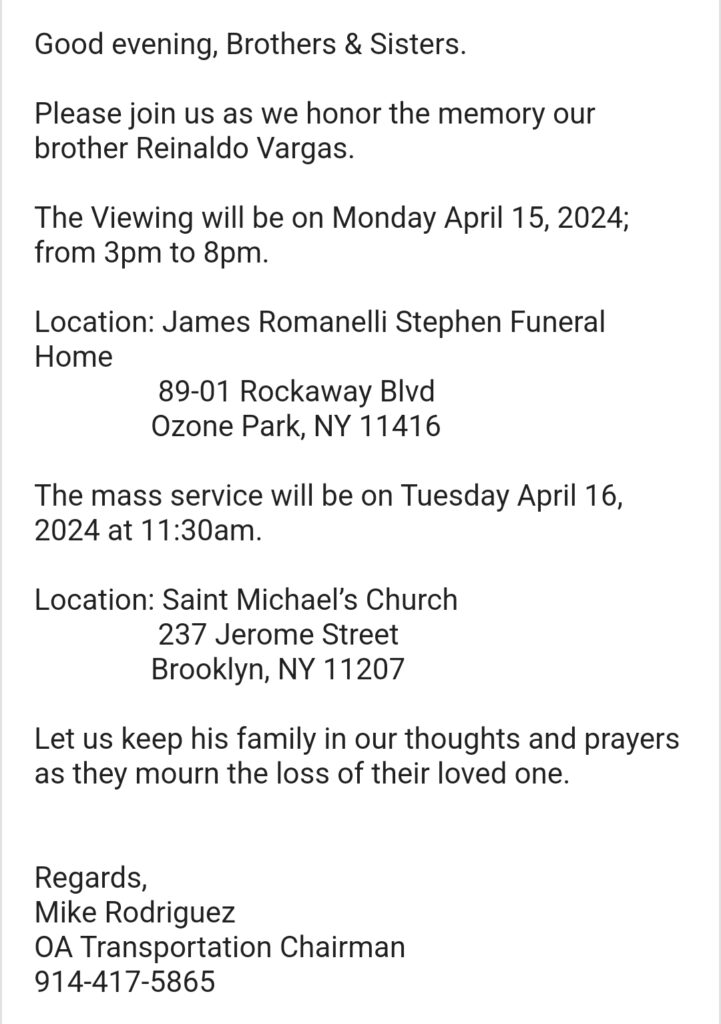 We are very sorry to report that our Brother, Reinaldo Vargas a Dispatcher at the ENY Bus Command Center and 18 year veteran of the OA Department of Buses has passed away. We mourn with the Vargas family and we will be there for them in their time of need.