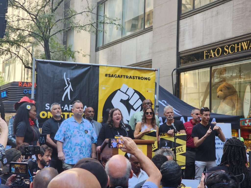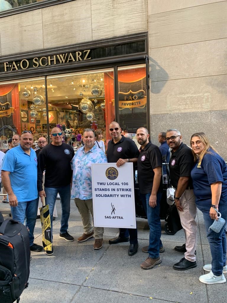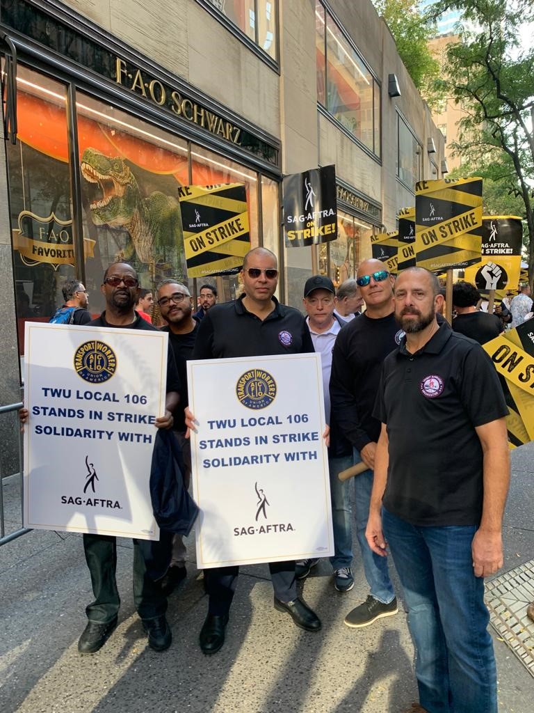 TWU International President John Samuelson called on all of the TWU Locals to come out to 30 Rockefeller Plaza today and join the striking workers of SAG-AFTRA at their rally. And of course many of our Local 106 officers came out and walked the picket line in show of support. It was a great day and we hope the SAG-AFTRA negotiating team can settle the strike with a good contract for their members.